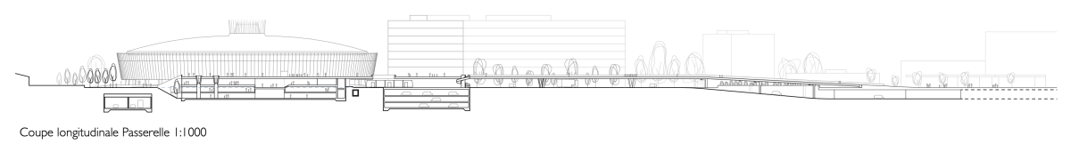 La passerelle cyclable et piétonne mène au parking à vélo, entouré d'une rampe permettant de rejoindre le sol naturel dans la boucle du tram. La trémie d'accès au tunnel autoroutier sous le parc des Palettes est couverte par l'accroche de la passerelle qui rend à la mobilité douce cet espace dédié à la voiture.