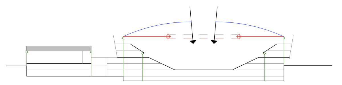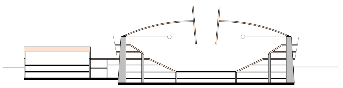 La voûte en bois fléchi activement (en bleu) supporte l'oculus et le couronnement de la patinoire. Le lanterneau indique "c'est soir de fête* tout en accueillant les installations d'extraction d'air et de désenfumage, permettant aussi la ventilation naturelle.