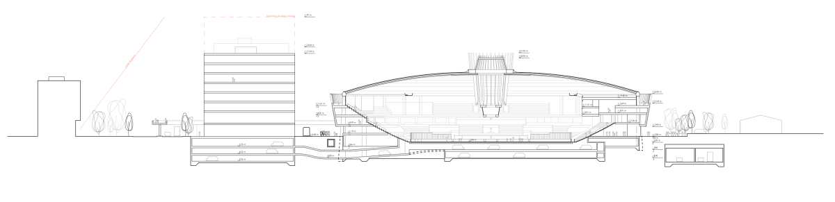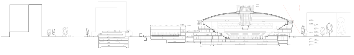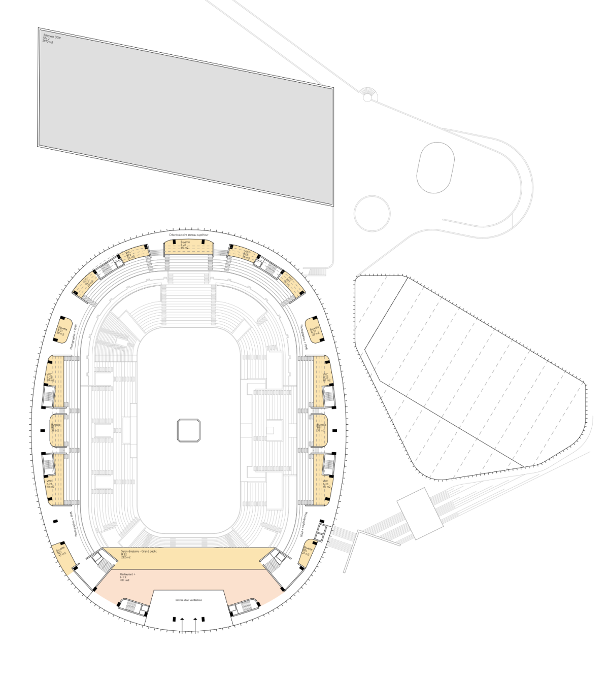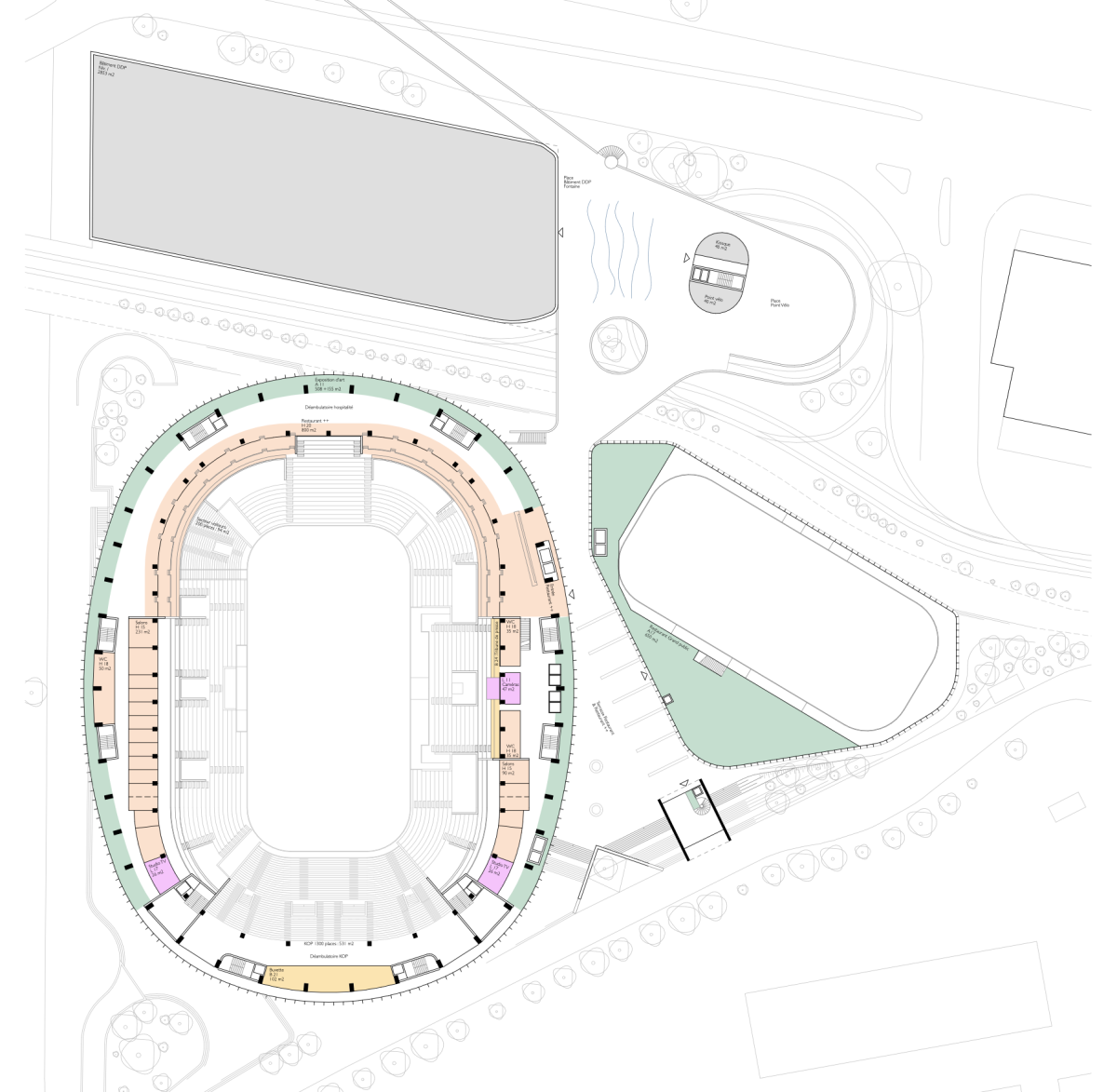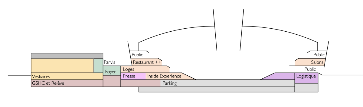 La patinoire principale est légèrement enterrée, afin de cacher la logistique et les services. Le niveau d'accueil du public est ainsi un peu surélevé, offrant toujours un forte perméabilité avec l'extérieur, mais permettant de réduire la profondeur des fouilles.