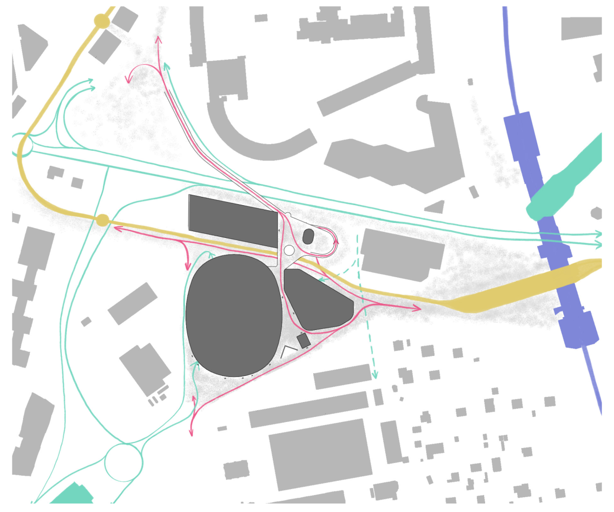 Ni plateau, ni vomitoires, les larges accès aux tribunes offrent dans les angles des possibilités d'interaction sociale et des espaces dégagés. Les angles arrondis accompagnent la foule sans heurts.