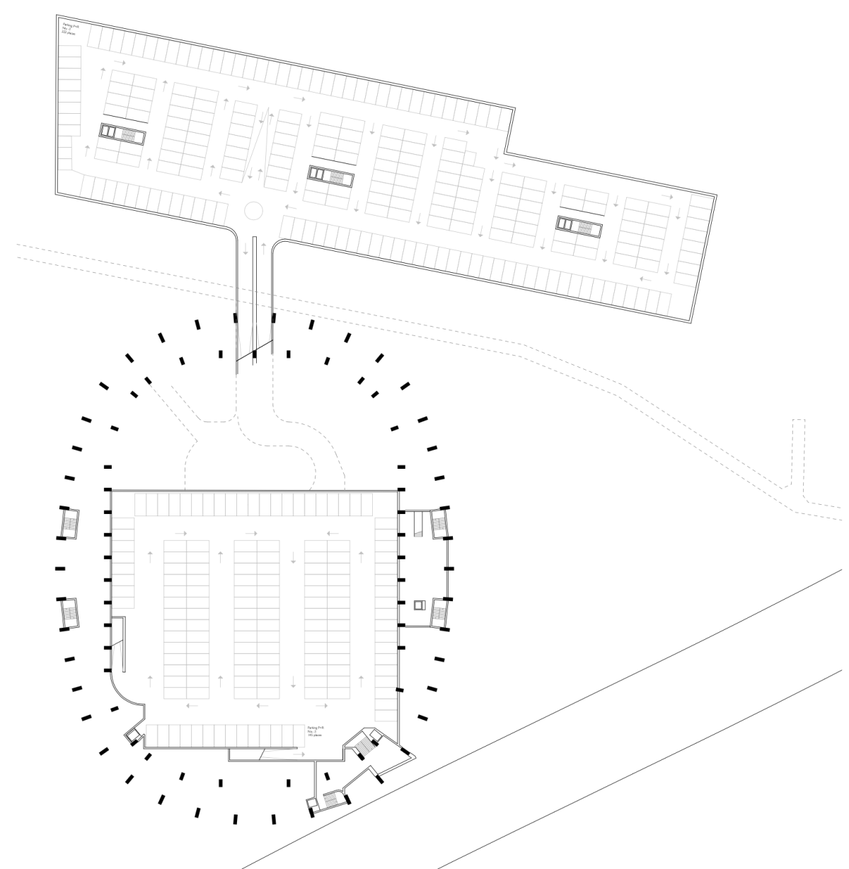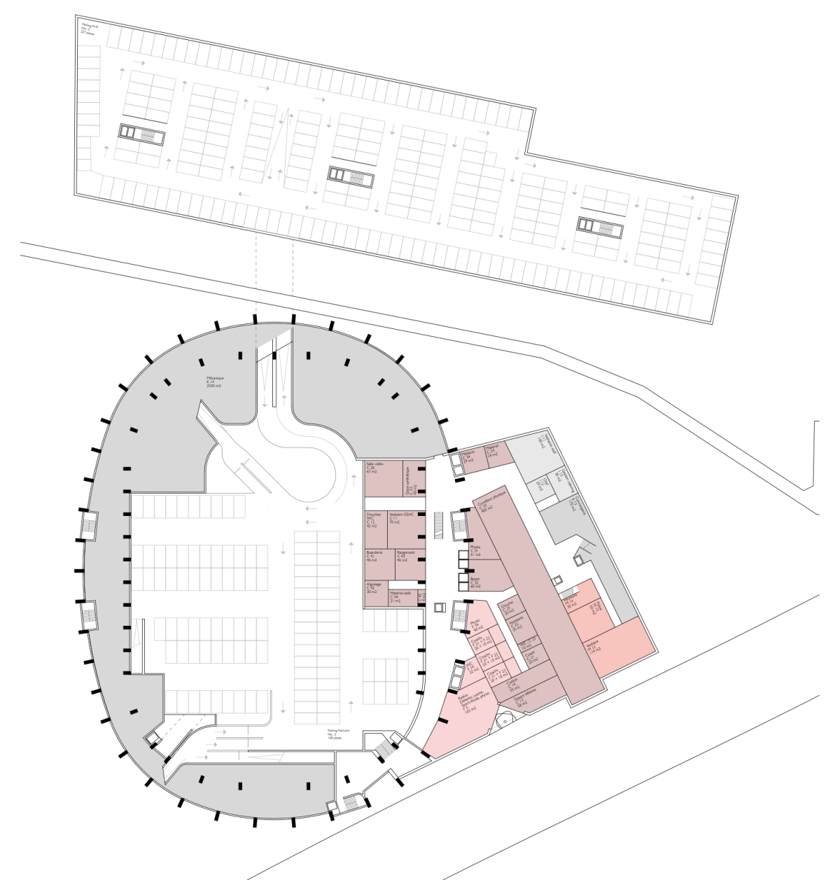 Le bâtiment DDP fonctionne en synergie avec le parking à voiture et deux roues. Le long de la route de Saint-Julien, il respecte la volumétrie du bâtiment du Trèfle d'Or et participe à la création d'un morceau de ville.