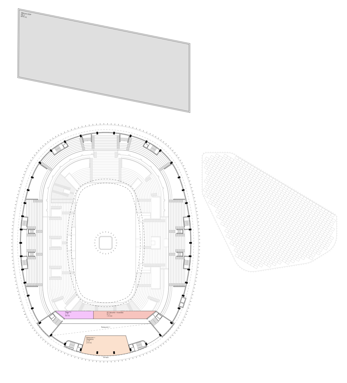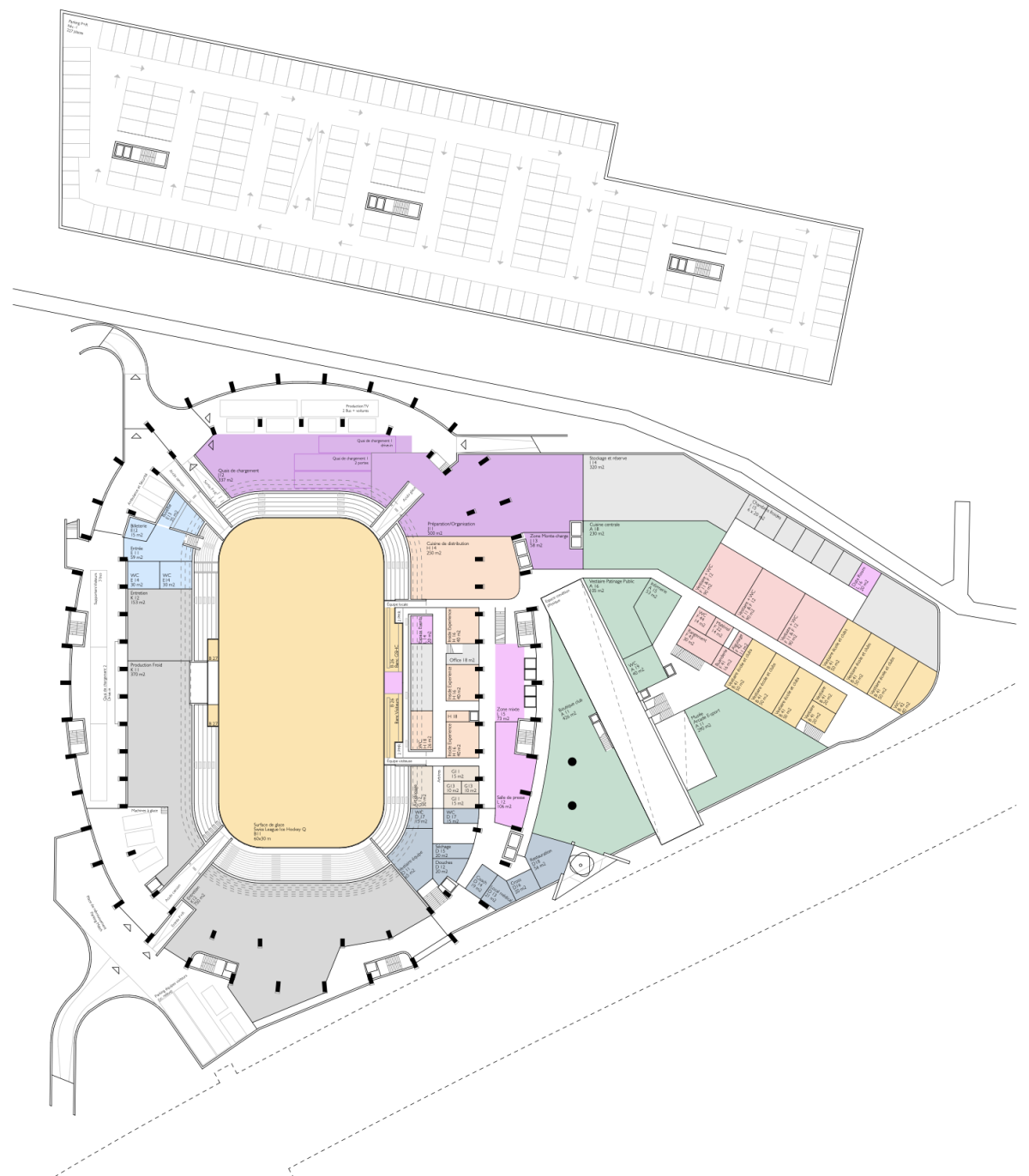 Glace principale / Circulation poids lourds et livraisons / Vestiaires de la patinoire d'entraînement et de l'équipe visiteur / Cuisines et logistique
