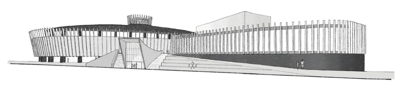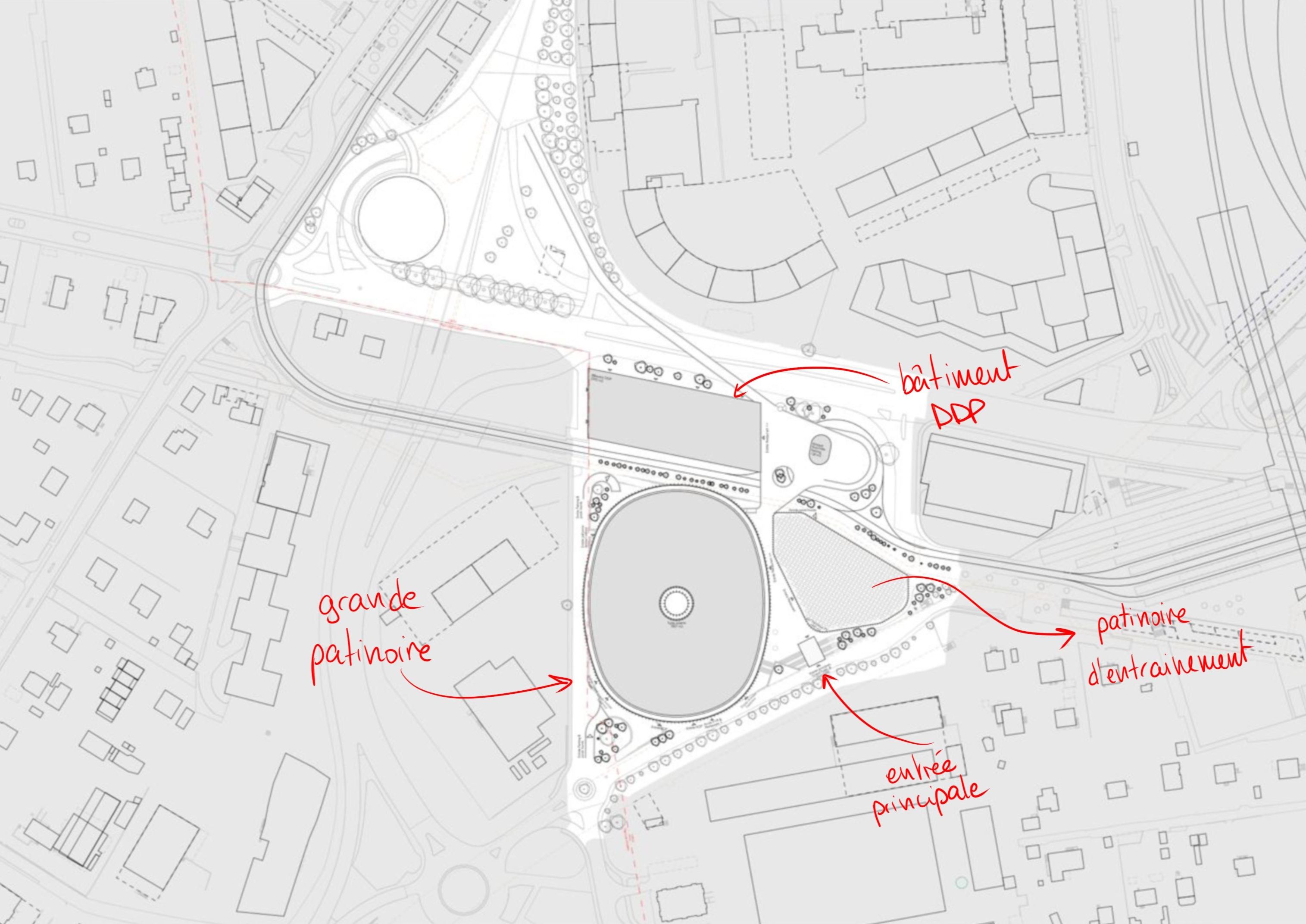 Au nord le bâtiment DDP pour la densification du quartier. Le grand ovale sur la gauche est la patinoire principale, le volume aux nombreux angles arrondis sur la droite est la patinoire d'entraînement et entre les deux, le volume vertical de l'entrée commune.