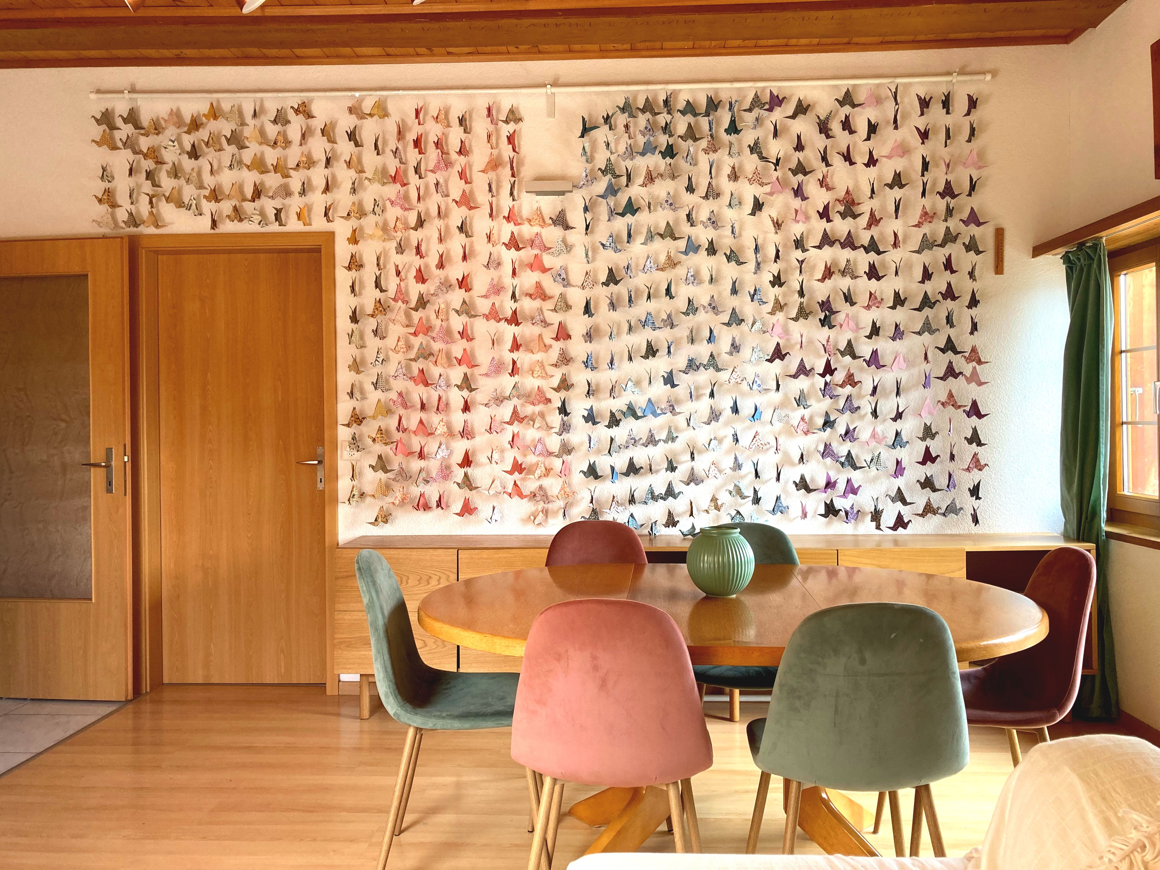 En s'inspirant de la légende des mille grues, le choix s'est porté sur un rideau formé de grues en origami dans des papiers colorés et à motifs. Le processus commence par le choix des papiers qui doivent être harmonieux et différents. Ensuite vient la longue partie des plis, environ 90 secondes par grue. Puis les origamis sont triés selon leurs couleurs pour former un dégradé allant des teintes ocre au rose au bleu et au violet. Les grues sont cousues ensemble par rangée de 16 et attachées à une tringle à rideau. La tringle a été choisie pour se détacher du mur, ce qui permet aux délicats pliages d'osciller selon les fluctuations de l'air dans la pièce. Le choix des couleurs s'est fait pour que les origamis aux teintes plus foncées (violets) se trouvent près de la fenêtre où l'apport de lumière est le plus grand. Les grues blanches et moutardes sont elles, proches de la porte en bois, avec laquelle les teintes se marient joliment. Un espace vide est laissé au-dessus de la lampe, pour éviter tout risque de surchauffe des papiers.