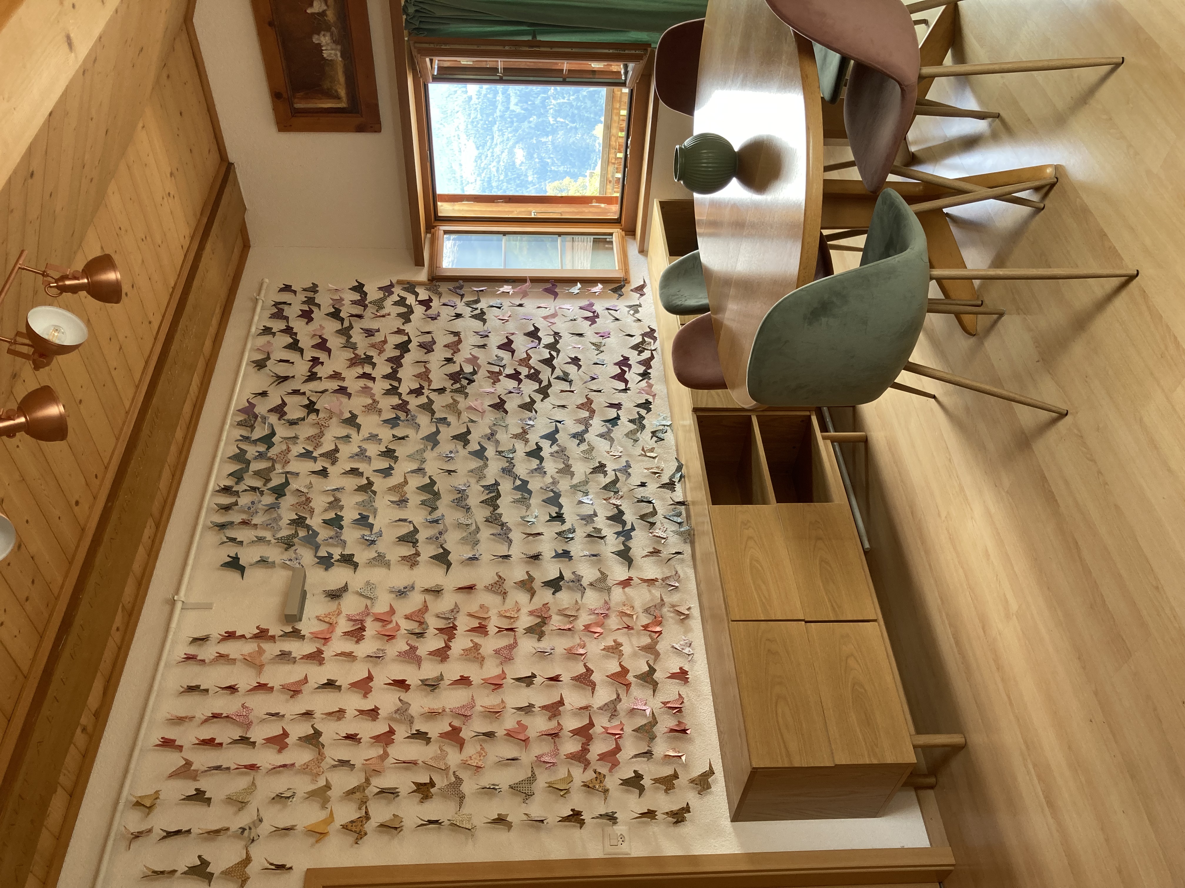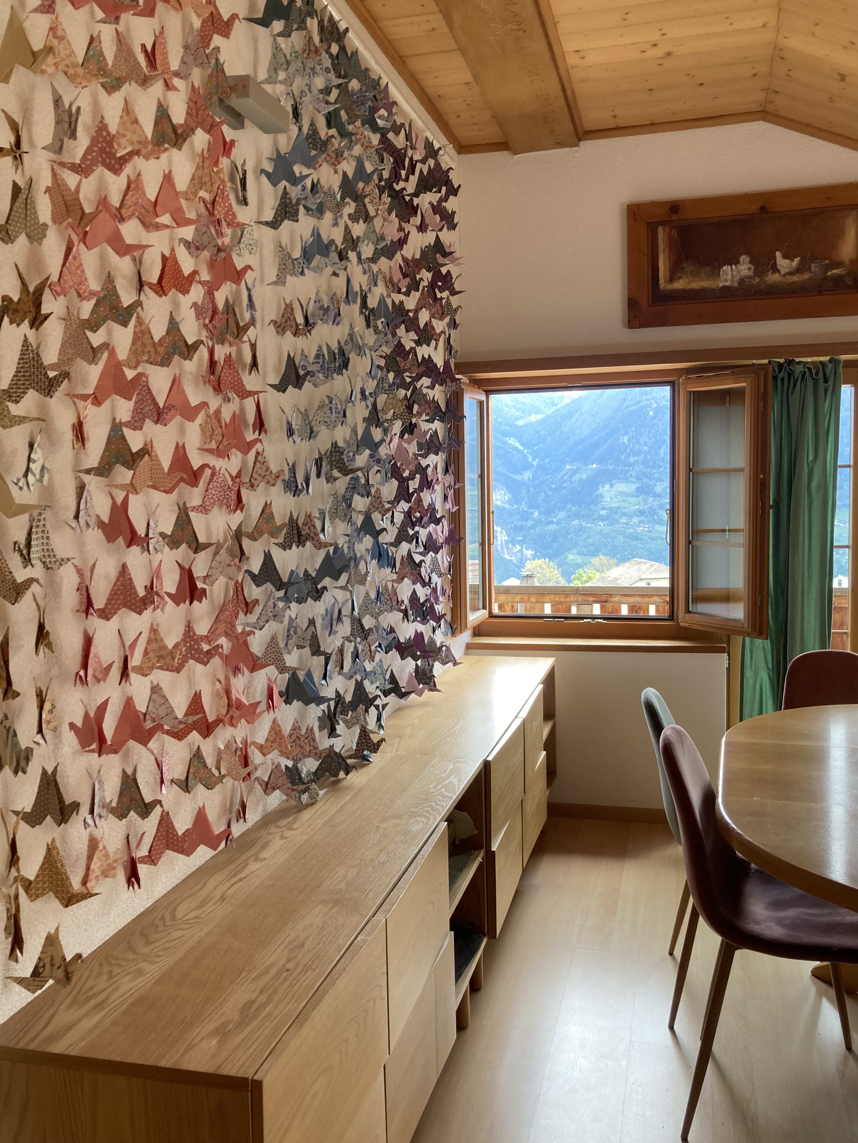 Depuis l'entrée dans la pièce, le regard file le long des buffets vers l'horizon où la vue par-dessus les toits s'ouvre sur toute la vallée. La poutre faîtière au plafond est gravée des inscriptions des bâtisseurs-euses du bâtiment, vieux de plus d'un siècle. La ligne que forme les buffets forme un miroir avec la poutre, accentuant la course du regard vers l'échappée visuelle. On observe depuis ce point de vue que les grues sont décollées du mur. Elles sont cousues entre elles délicatement par du fil à coudre blanc et sont indépendantes les unes des autres. Cela leur permet de tourner à des rythmes différents, rendant la mosaïque en constante évolution.